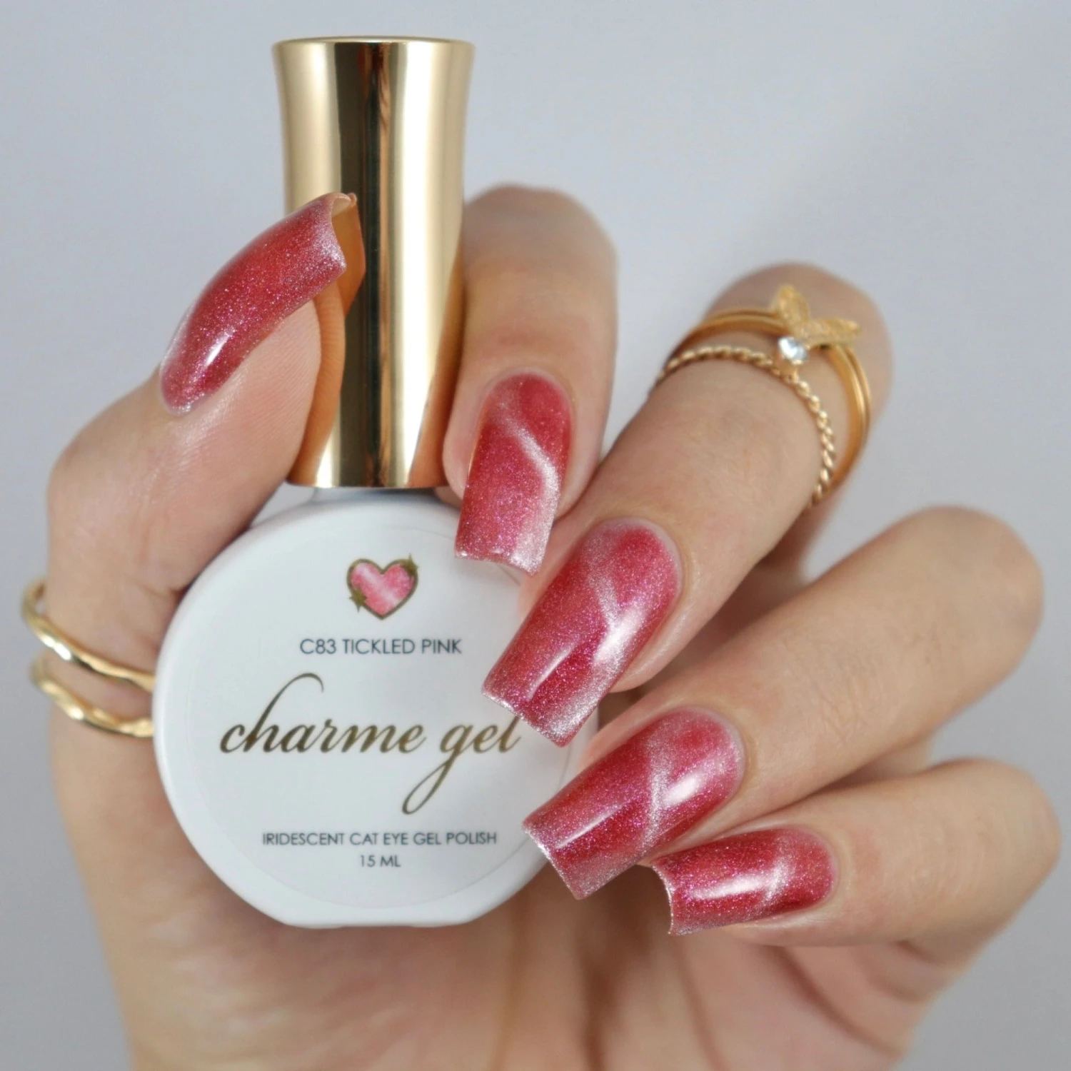 C83 Tickled Pink – Romantic raspberry pink shimmer with pink iridescent sparkles, a perfect cat eye polish to accent your pink manicures.
