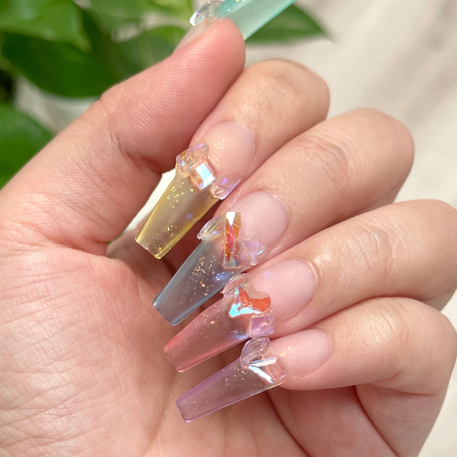 G21 Wanderlust – A dreamy iridescent glitter gel that’s perfect for adding magical iridescence to any manicure! Wanderlust is packed full of iridescent glitter that shifts color between blue and orange, changing hue over different base colors. It’s great for adding that extra sparkle to transparent glass nails as well, or create your own glitter jelly sandwich by layering it with other jelly/translucent colors. Definitely a must have if you love sparkling nails!