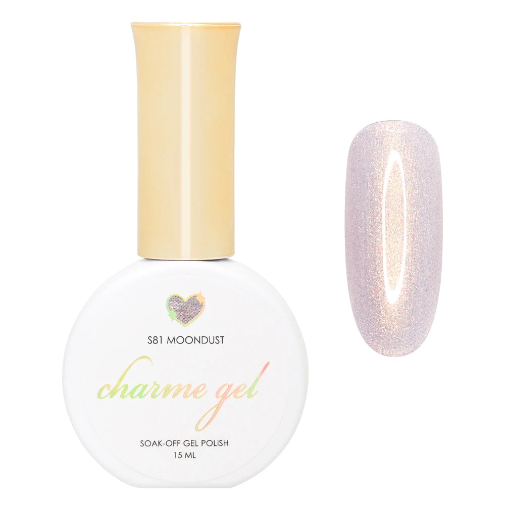 S81 Moondust – Add a little celestial shimmer to your nails with this pale lilac with a hint of beige jelly gel packed with pink and golden iridescent sparkles! Pretty with just one coat for a translucent shimmering look, or 2-3 coats for a more opaque effect. These beautiful shimmer gels can be layered over other colors to add iridescent sparkles to any manicure!