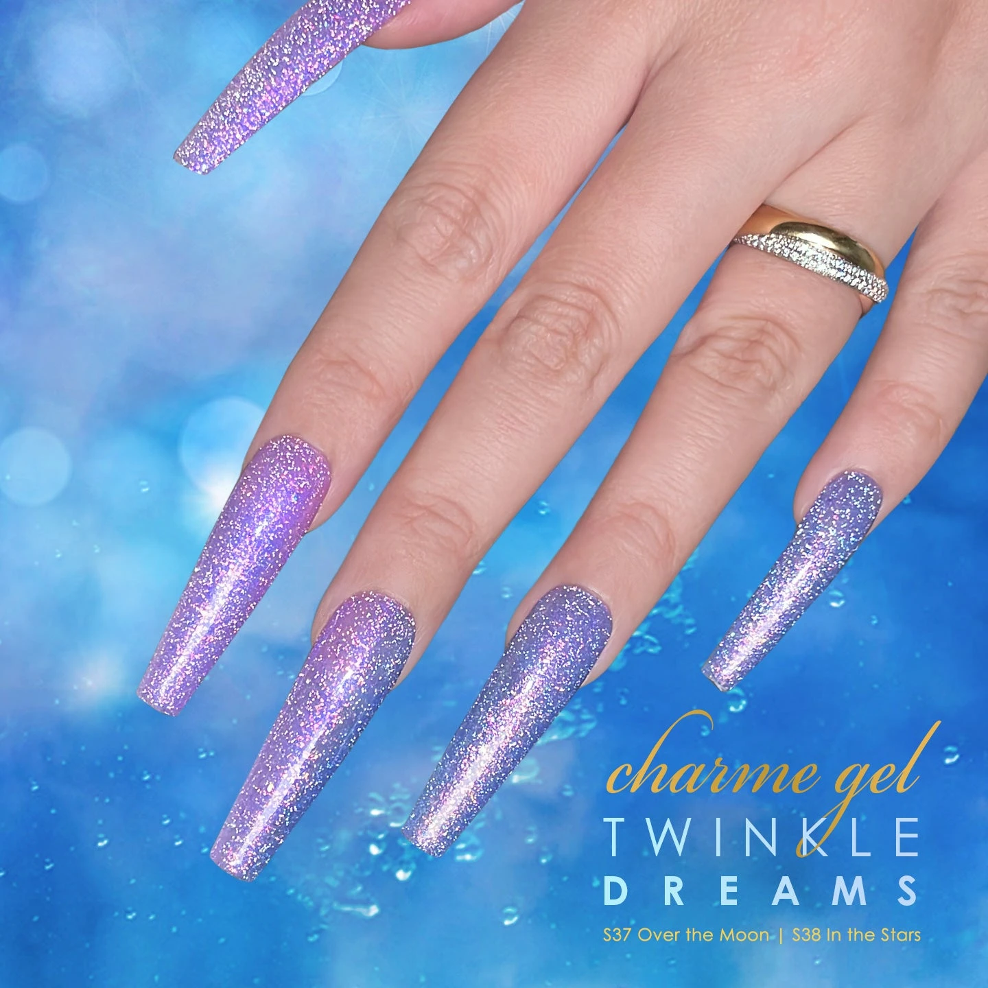 S37 Over the Moon – A serene shade of periwinkle blue that sparkles with flash reflective glitters and iridescent flakes that color shifts between pink, green and gold. This dreamy mermaid blue with a hint of violet is a must have color for spring and summer nails!