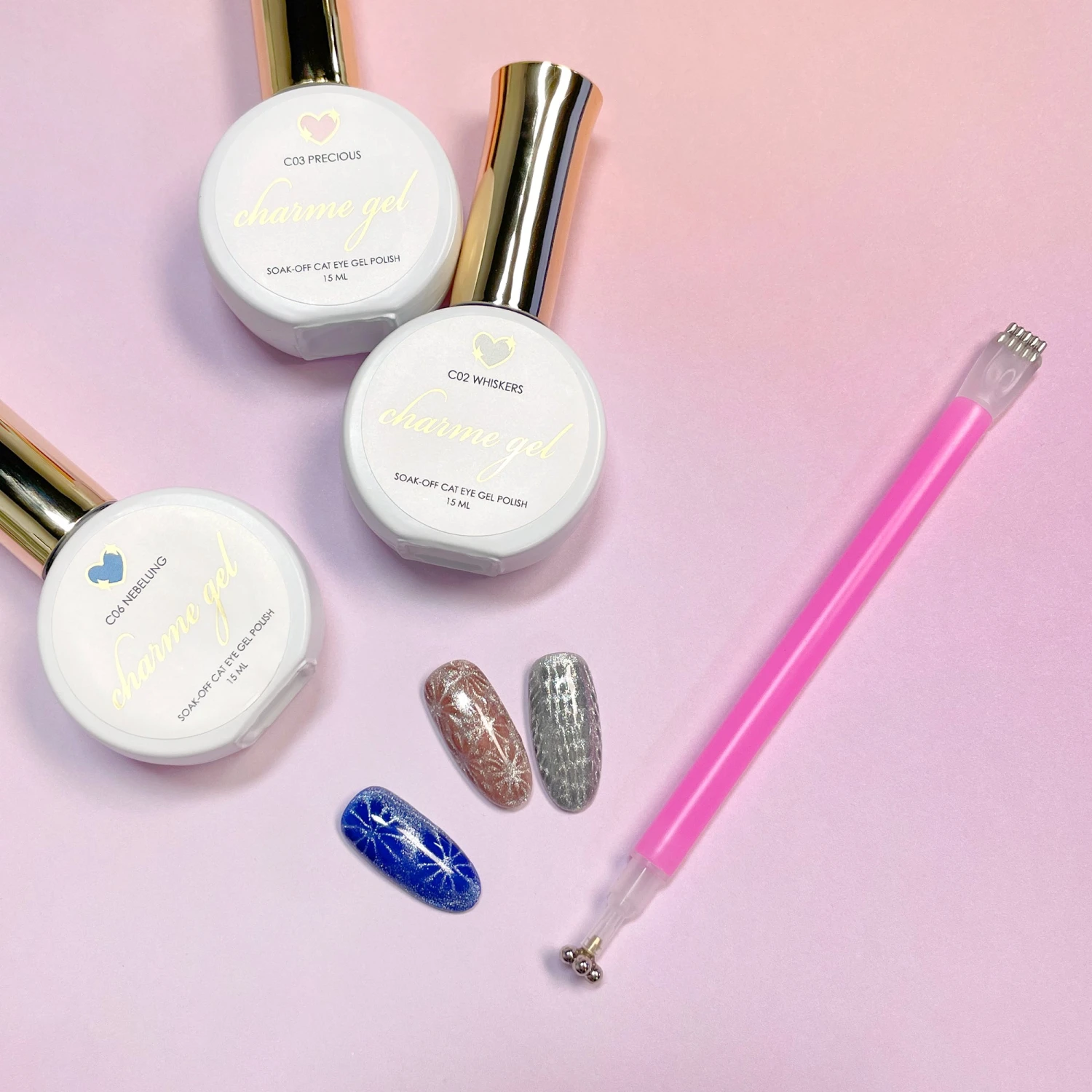 Use with magnetic cat eye gel, nail polish or chrome powders to create endless custom designs.
