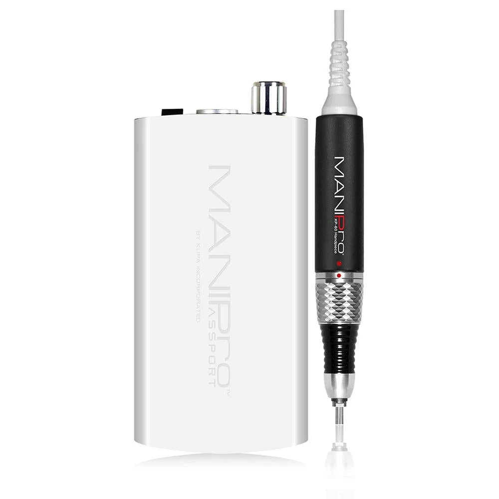KUPA’s MANIPro Passport®. This powerful, all new exclusive, portable electric nail file has been designed for the Professional Nail Technicians who demand power and portability. The MANIPro Passport® features a light weight battery powered *Acetone Resistant Finish* control box. This unit can provide anywhere from 8 to 10 hours of use per charge in either 110v or 220v. The MANIPro Passport® comes complete with a stainless steel belt clip and a plastic handpiece holster which can snap on either side of the control box.