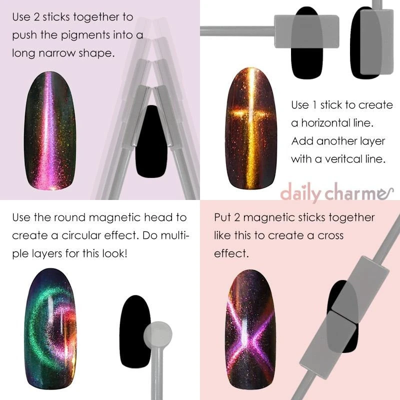 A double-ended magnetic wand with a magnet on each end, one rectangle and one circle. Use this wand with magnetic pigments, gels or polishes to create endless designs.