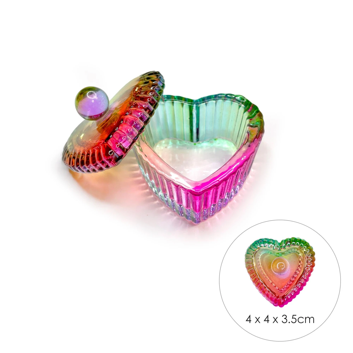 A heart shaped rainbow glass jar designed to work as a dappen dish for liquids like acrylic monomer, alcohol or water. It comes with a lid to prevent odors and slows the evaporation of liquids. Very handy when creating nail art with watercolor inks or water decals.