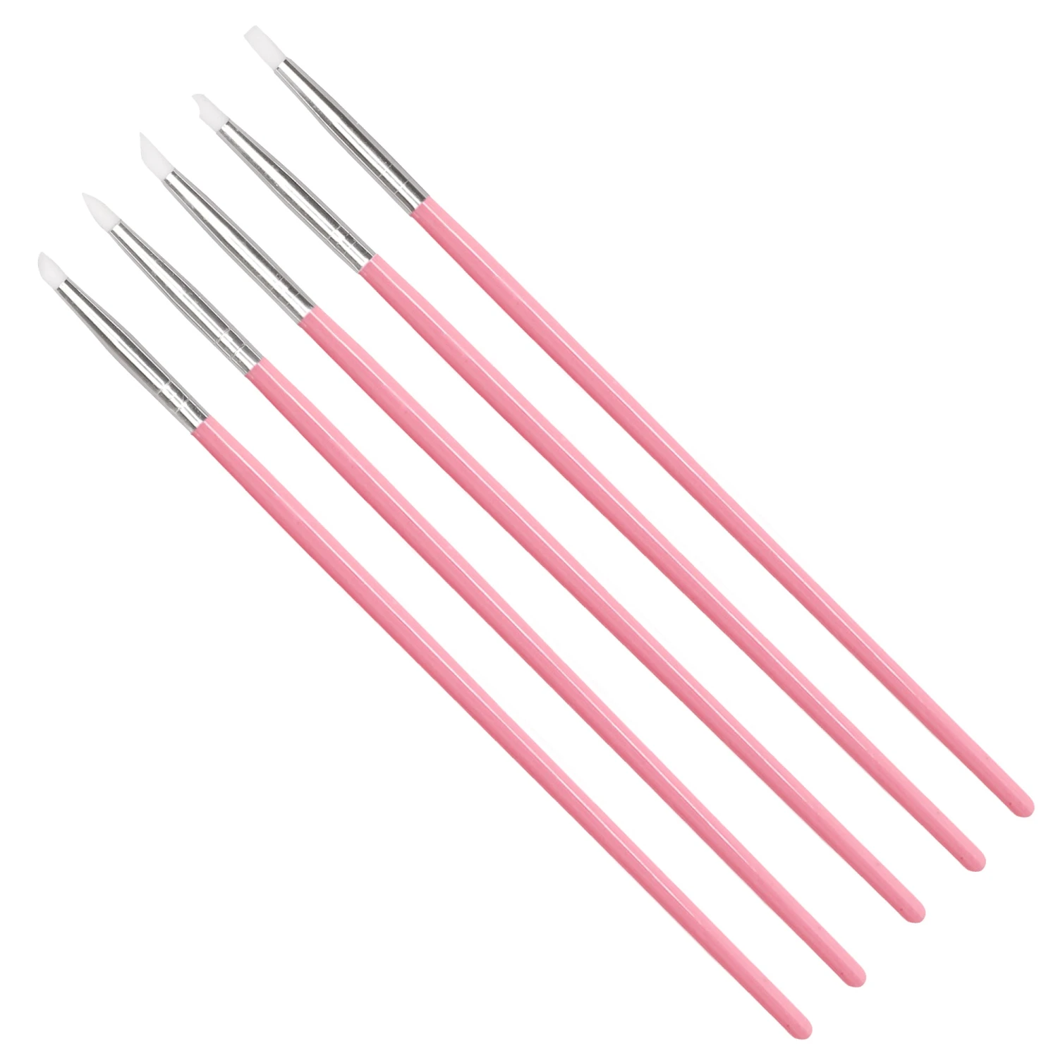 A set of 5 pink silicone brushes with different tip designs. Great for sculpting gel or acrylic 3D nail art designs, applying nail decors or cleaning up gels. The silicone tips make it really easy to clean, just use alcohol!
