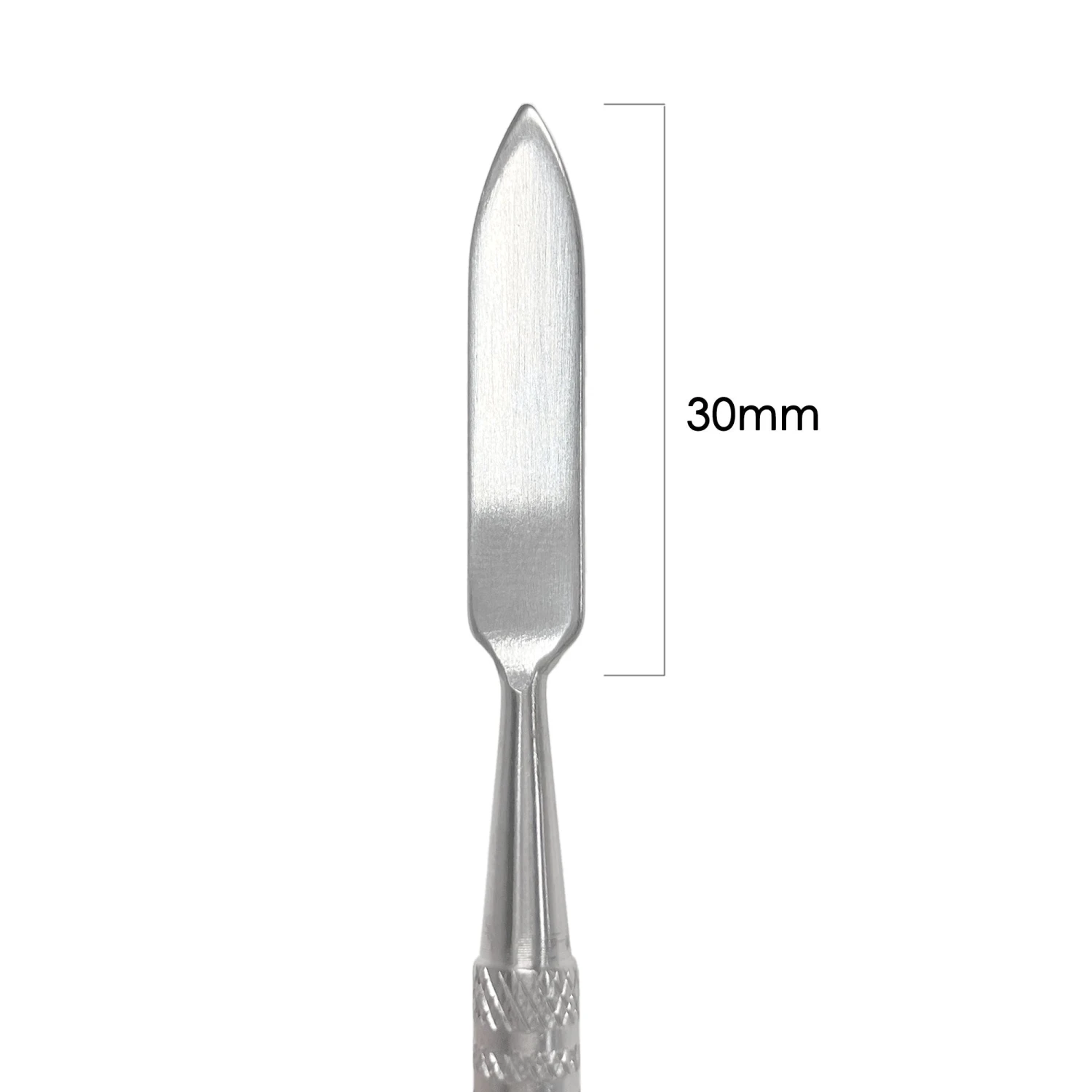 Professional stainless steel double-sided cuticle pusher featuring a flat spatula-like pusher and pointy nail cleaner. The flat pusher is great for pushing the cuticle without damaging the natural nail and can also be used as a tool to mix pigments, glitters or gels. Great for working with the 3D Gummy Gelly!