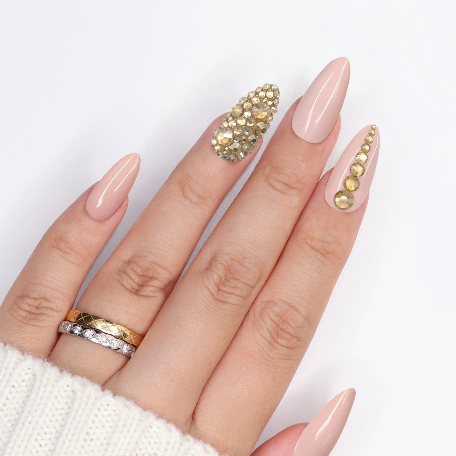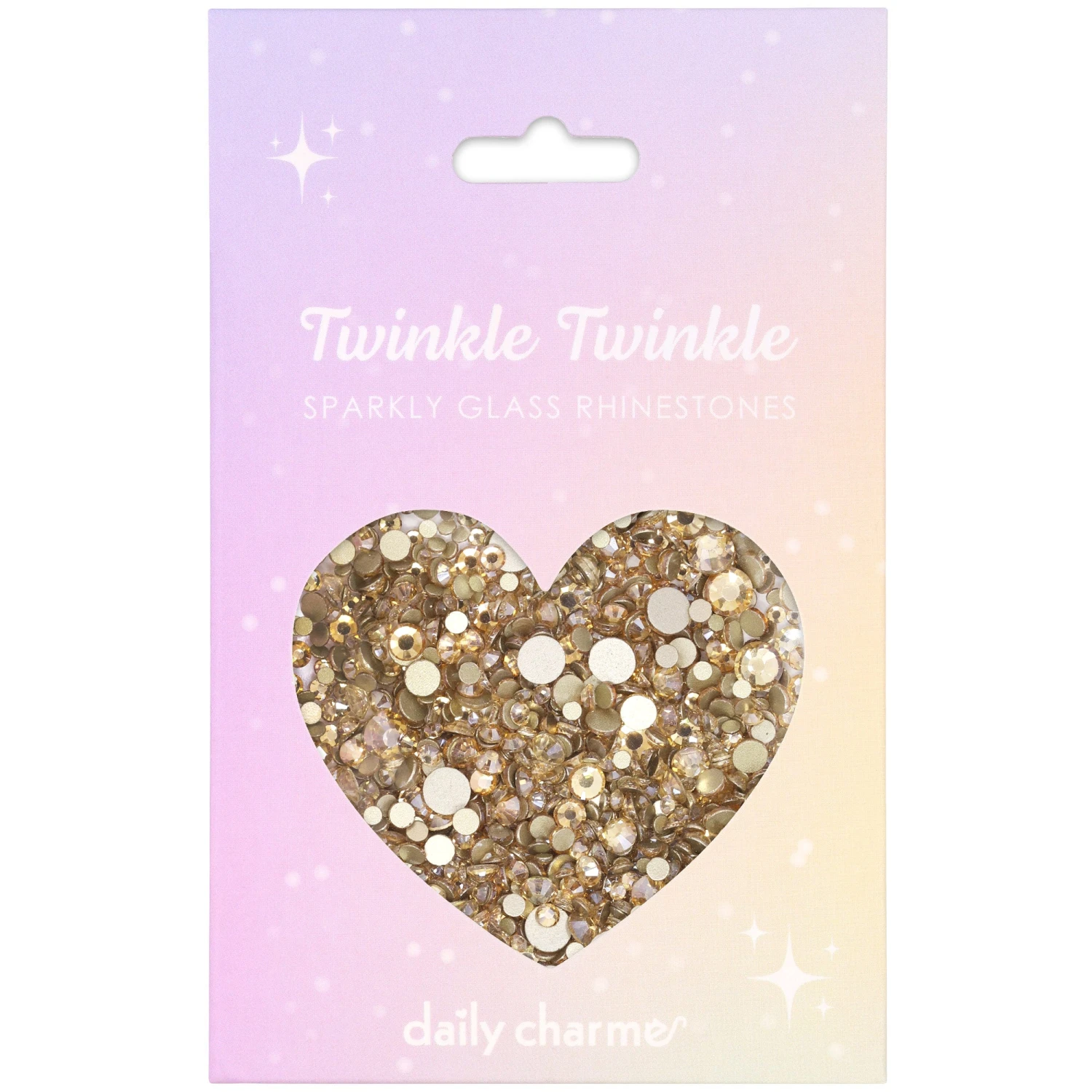 Twinkle Twinkle Sparkly Glass Round Flatback Rhinestone Mix in Golden Shadow – a special iridescent coating gives this champagne gold rhinestone a glimmering finish.