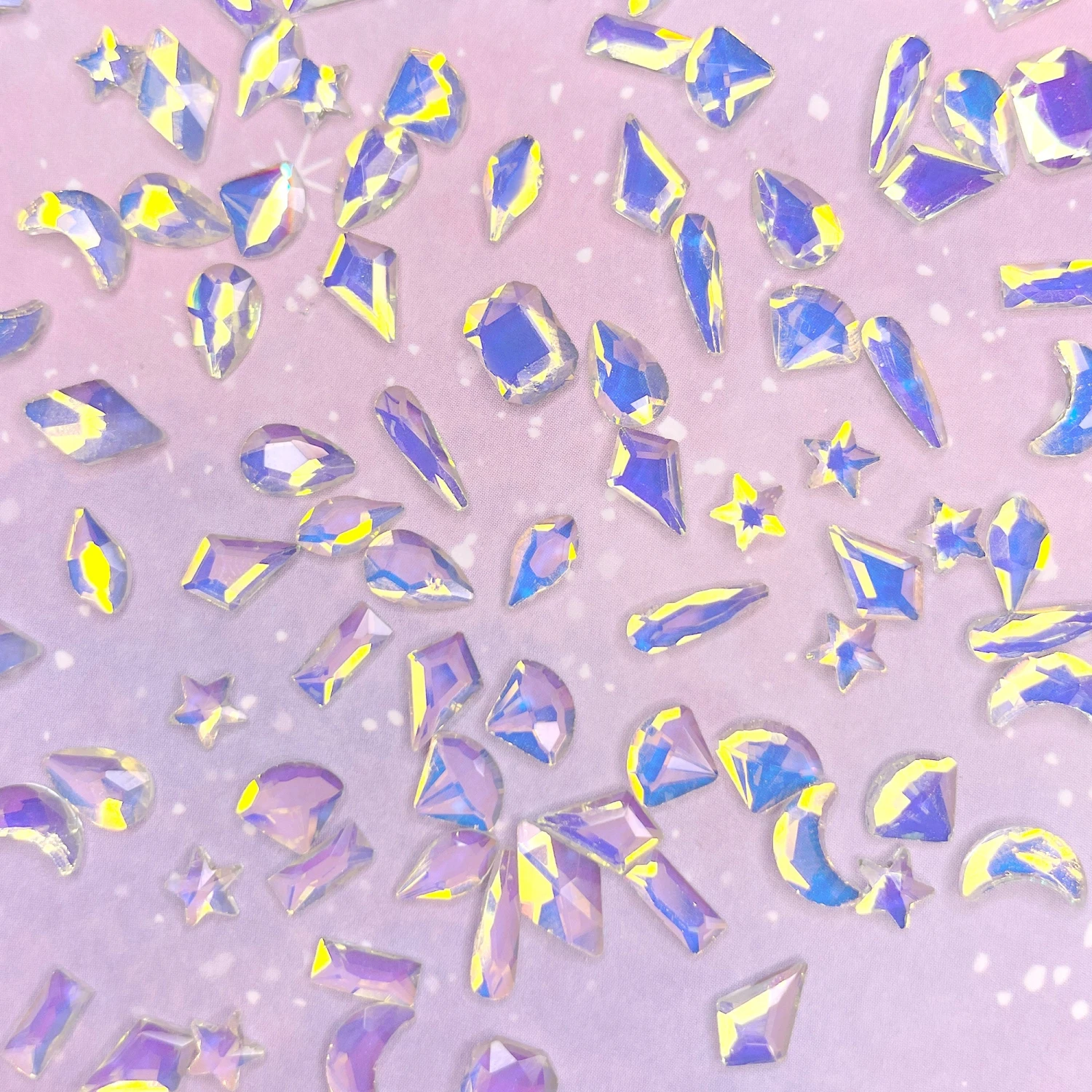 Twinkle Twinkle Sparkly Glass Shaped Flatback Rhinestone Mix in Crystal AB Unfoiled – a special aurora coating gives this clear rhinestone that signature AB shine. Unfoiled crystals has no silver backing and will allow the crystal to look different over different base colors.Â