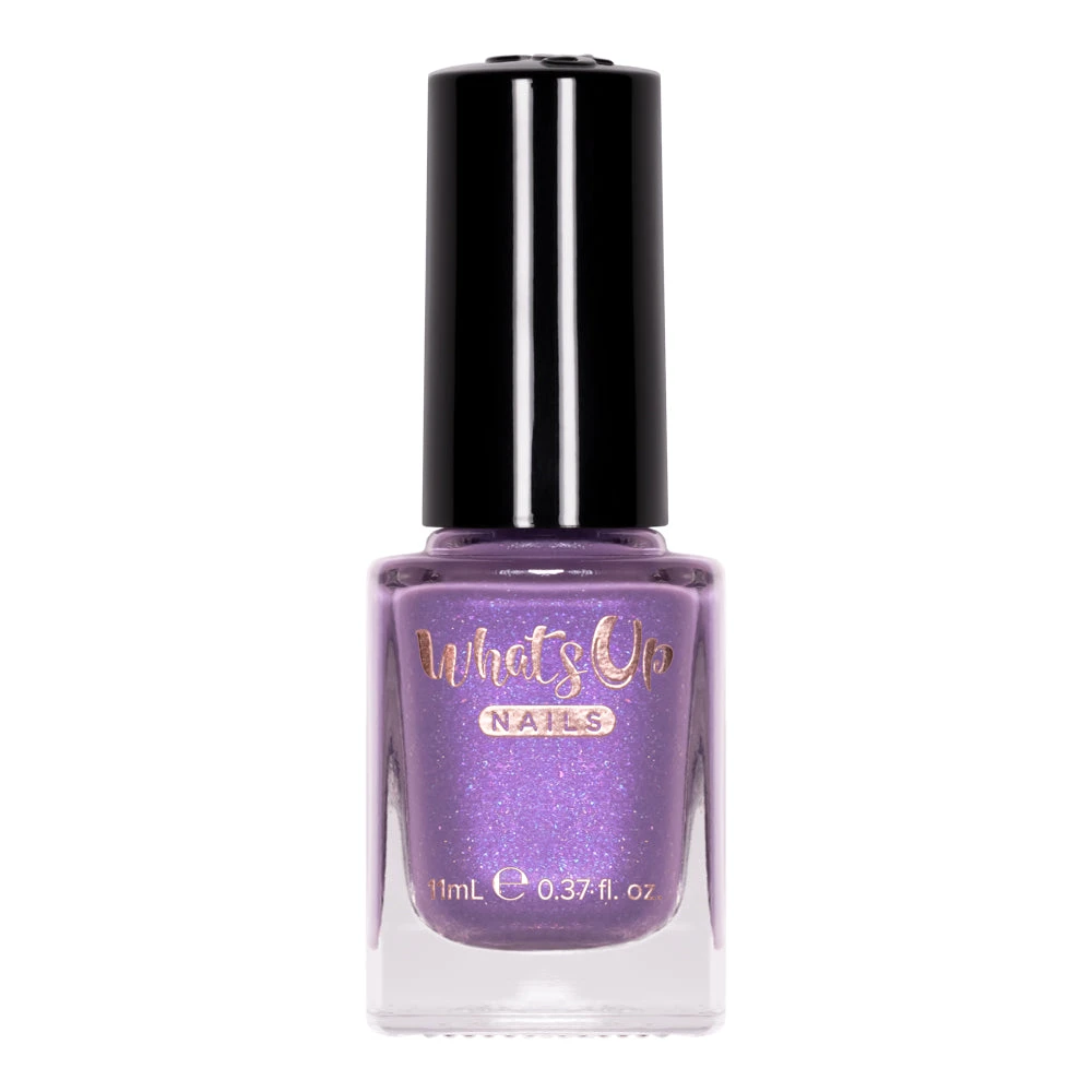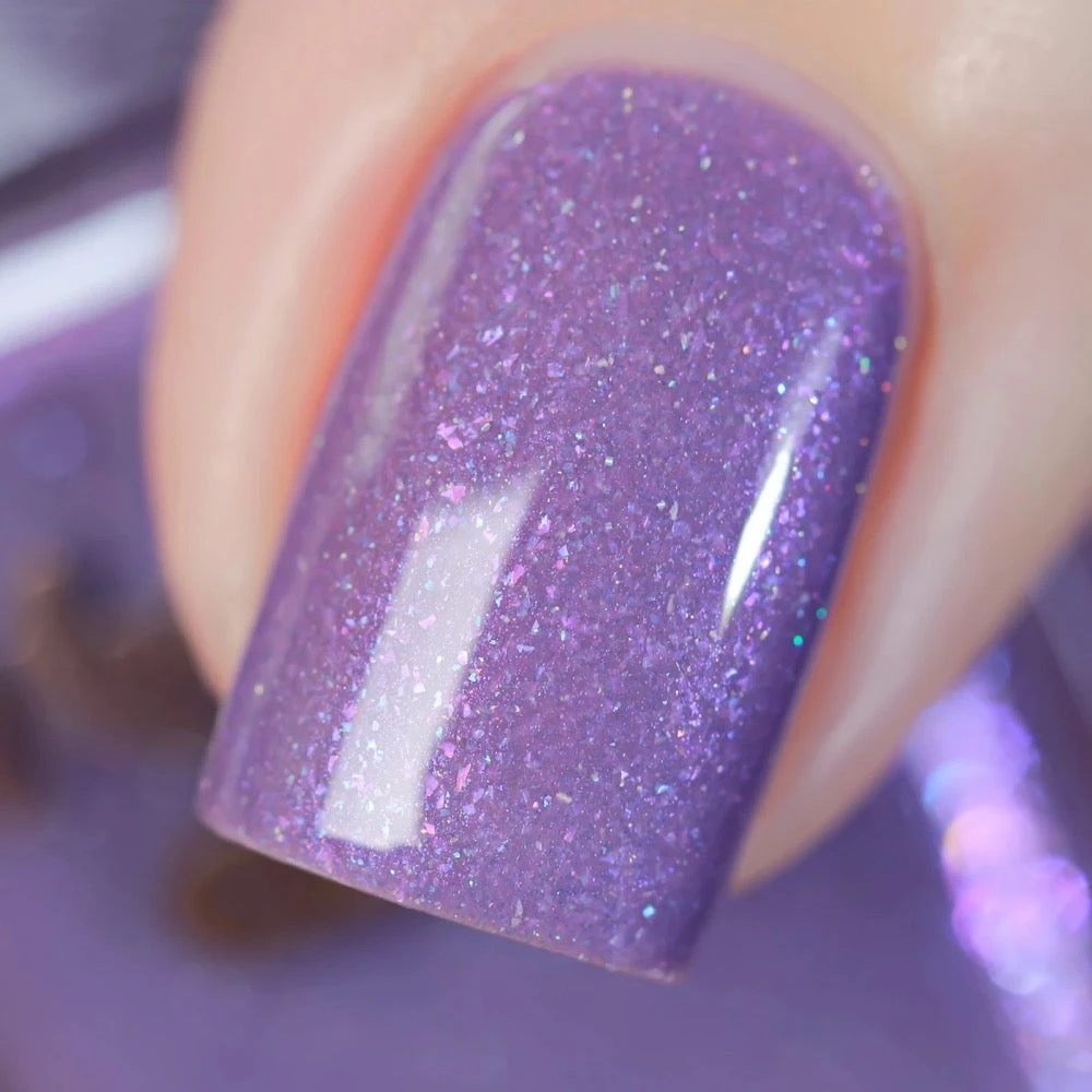 A stunning manicure starts with a beautiful nail polish, such as this one, a purple crelly with pink to purple iridescent duochrome flakies and holographic flakies to paint your nails with or create your fabulous nail art designs. For a fully opaque look it is recommended to apply 2 layers of polish. Use glossy top coat to get multi dimension effect.